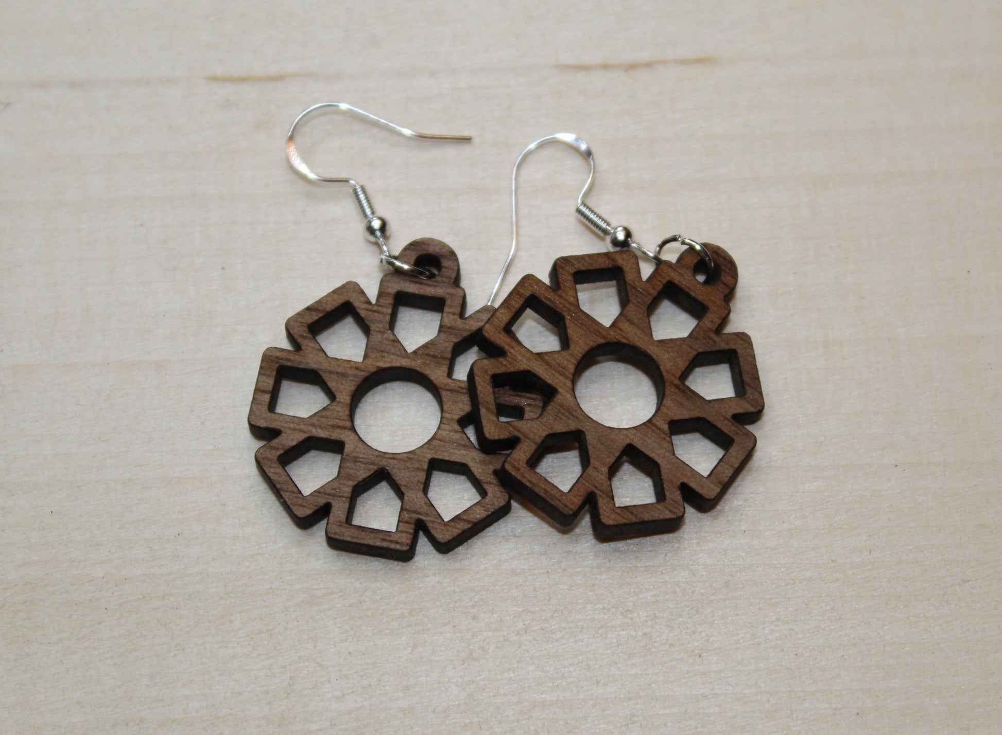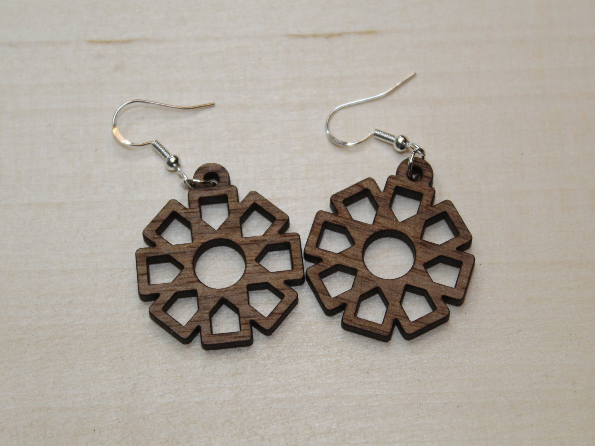 They are made from 1/8" thick walnut plywood and are sealed to resist scratching. The hooks are a sterling silver hypoallergenic earrings.