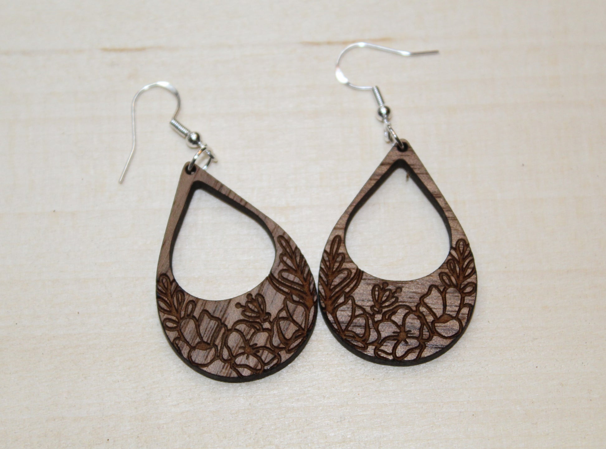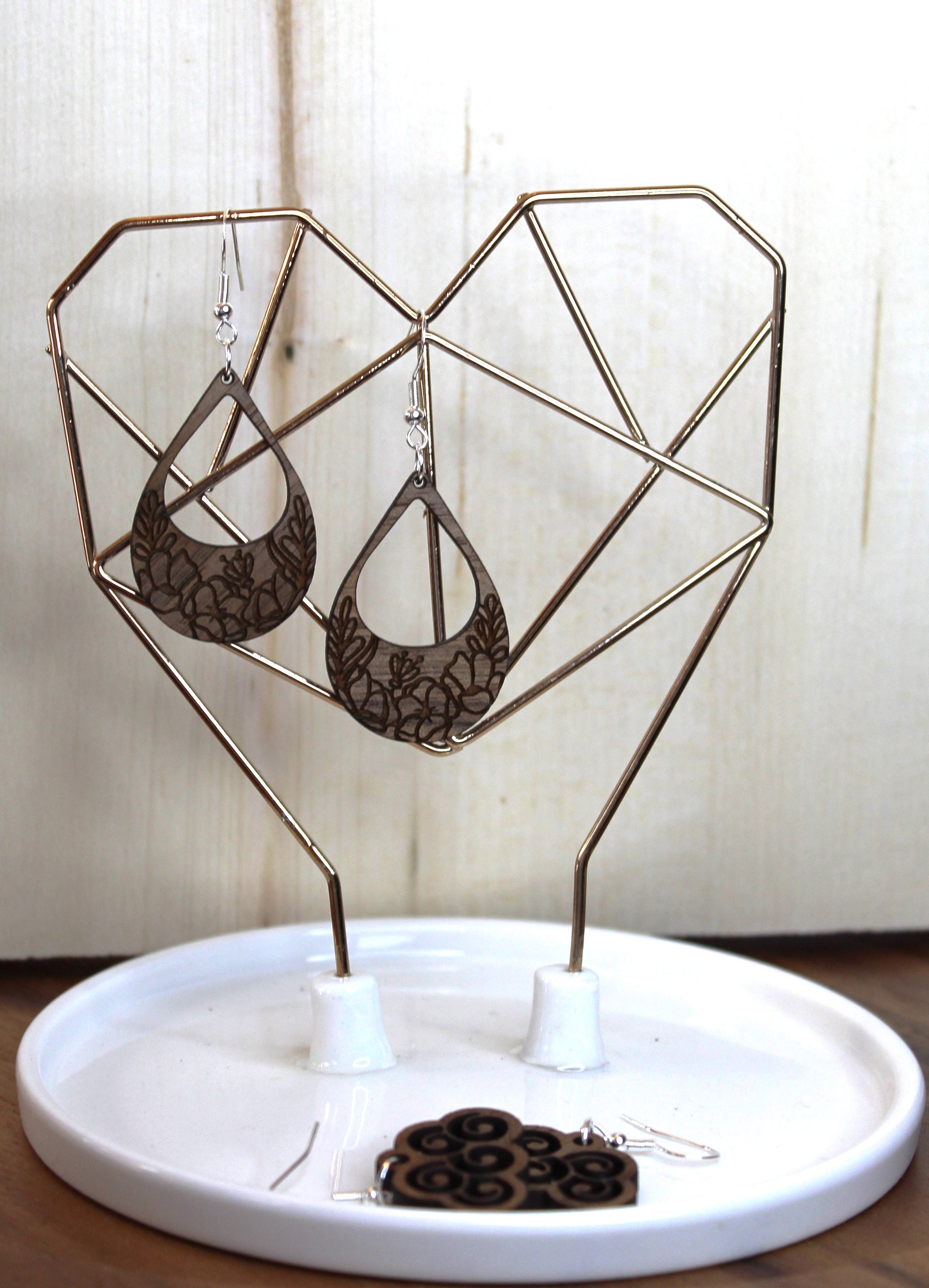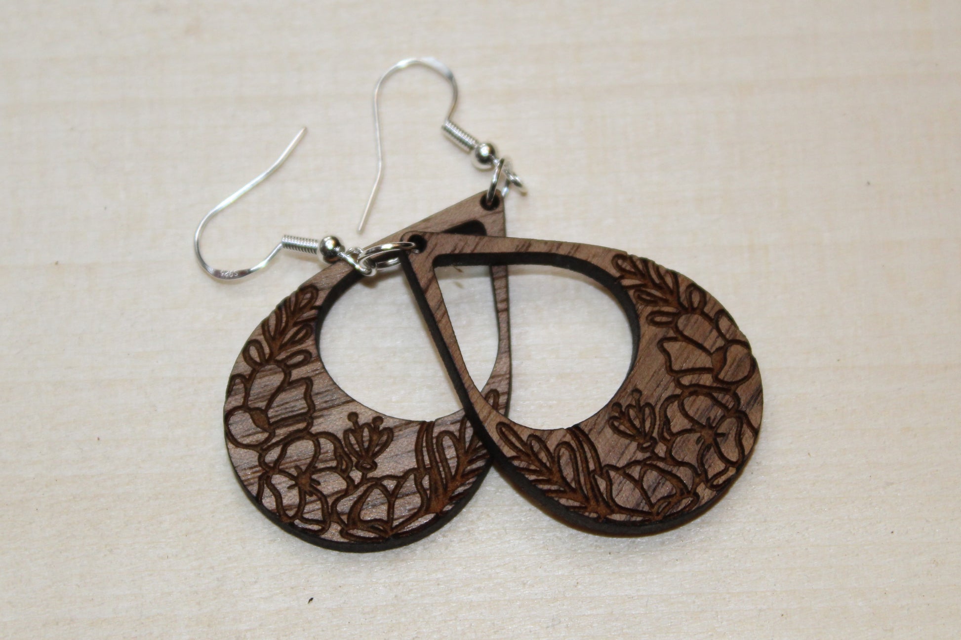 They are made from 1/8" thick walnut plywood and are sealed to resist scratching. The hooks are a sterling silver hypoallergenic earrings.