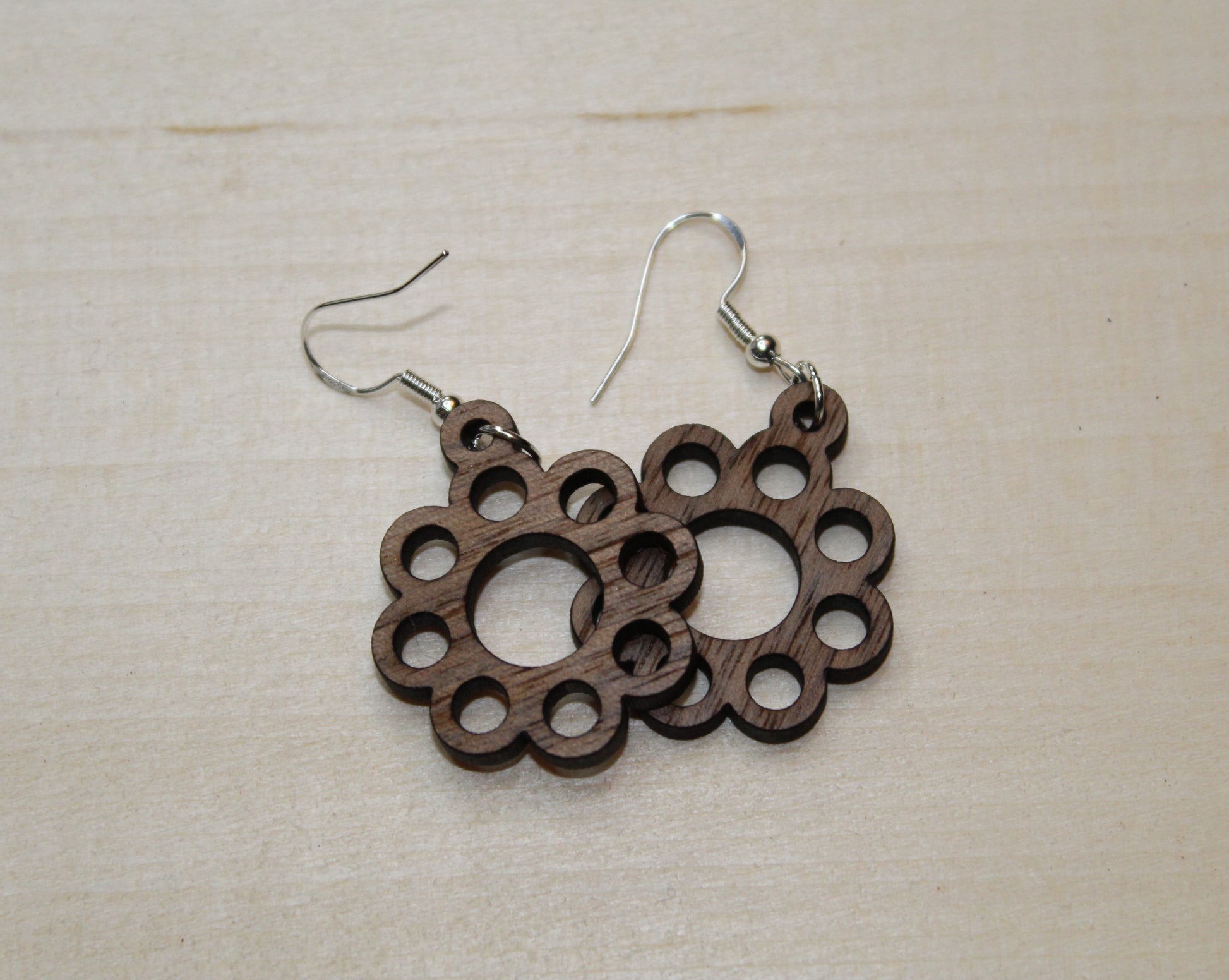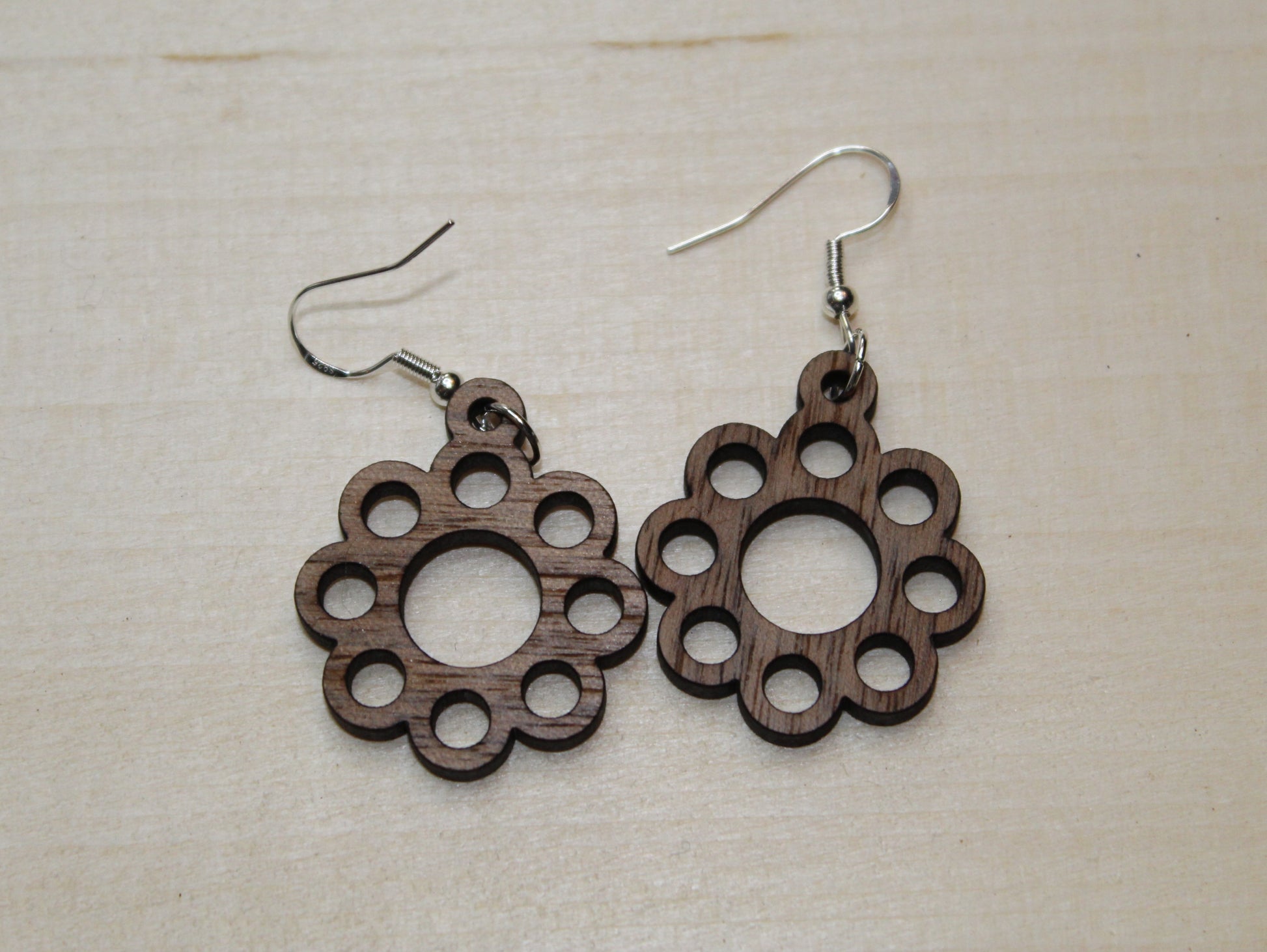 They are made from 1/8" thick walnut plywood and are sealed to resist scratching. The hooks are a sterling silver hypoallergenic earrings.