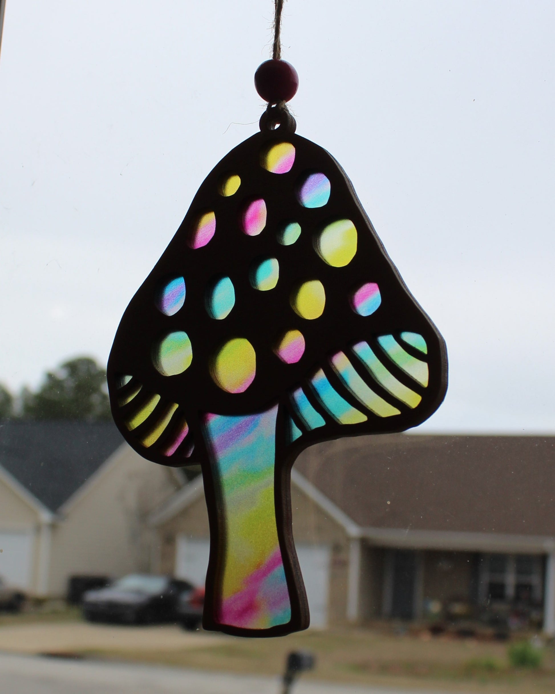 Wood pattern/color and "stained glass" colors may vary from piece to piece, making each and every suncatcher unique in its own way.