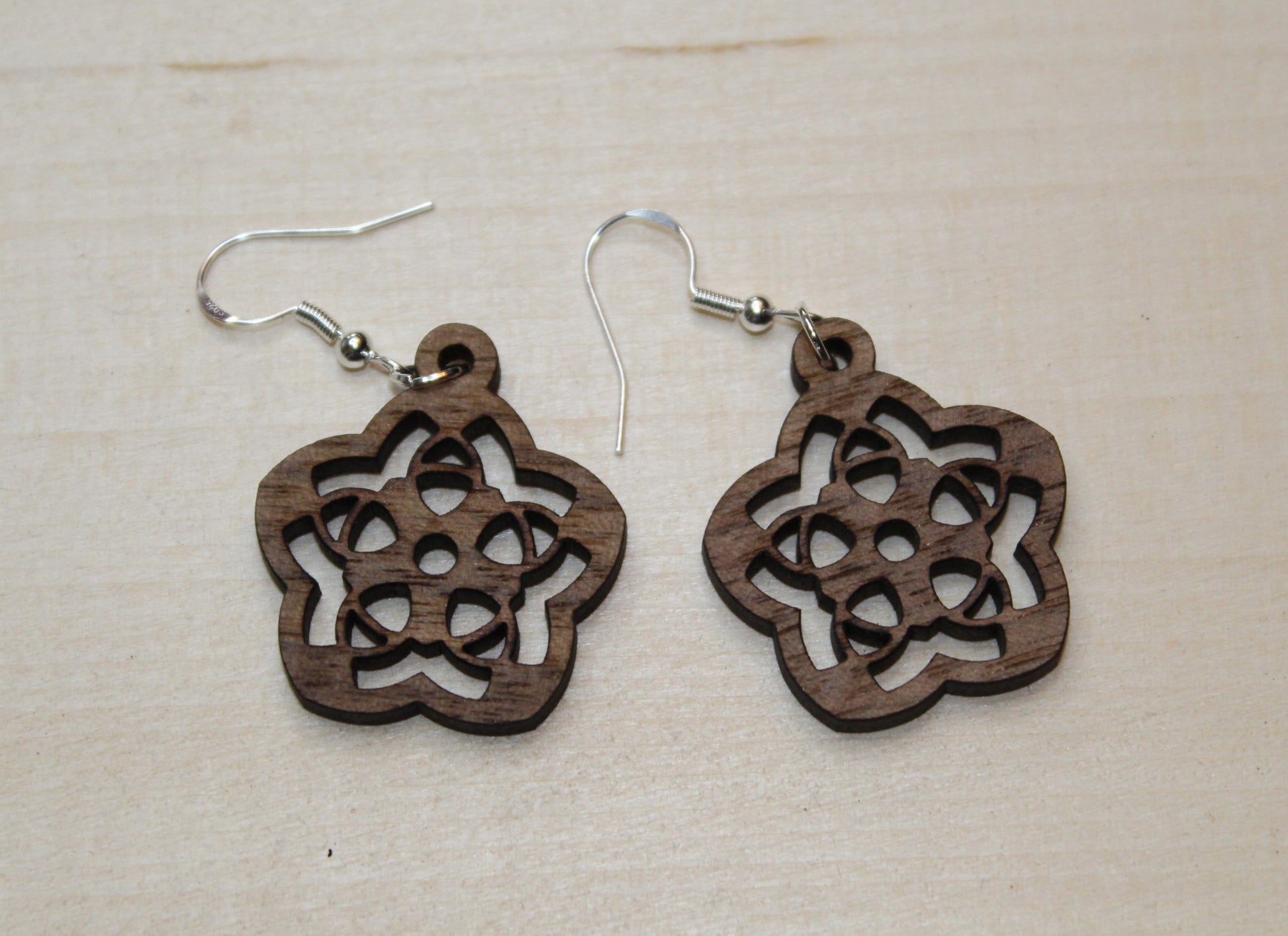 They are made from 1/8" thick walnut plywood and are sealed to resist scratching. The hooks are a sterling silver hypoallergenic earrings.