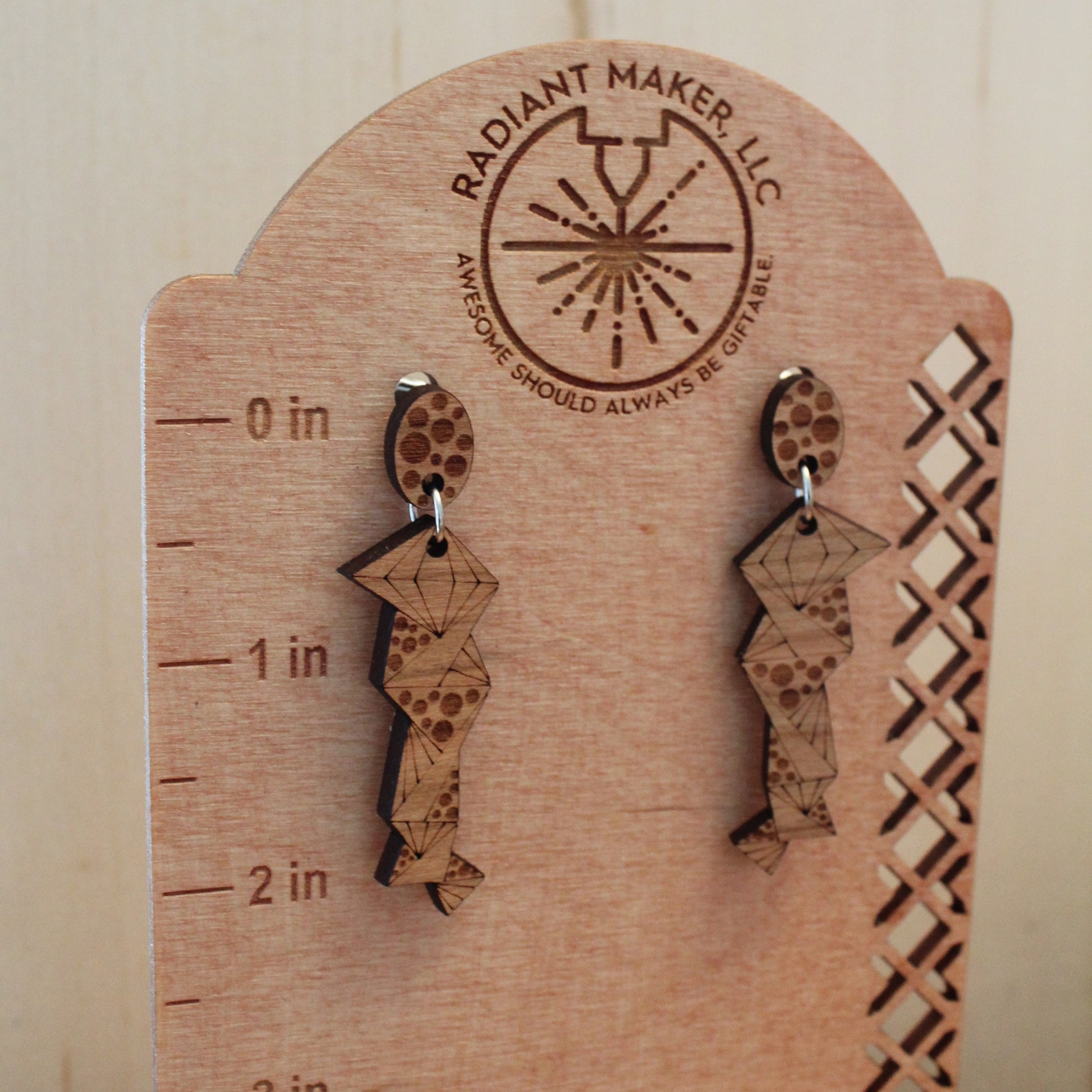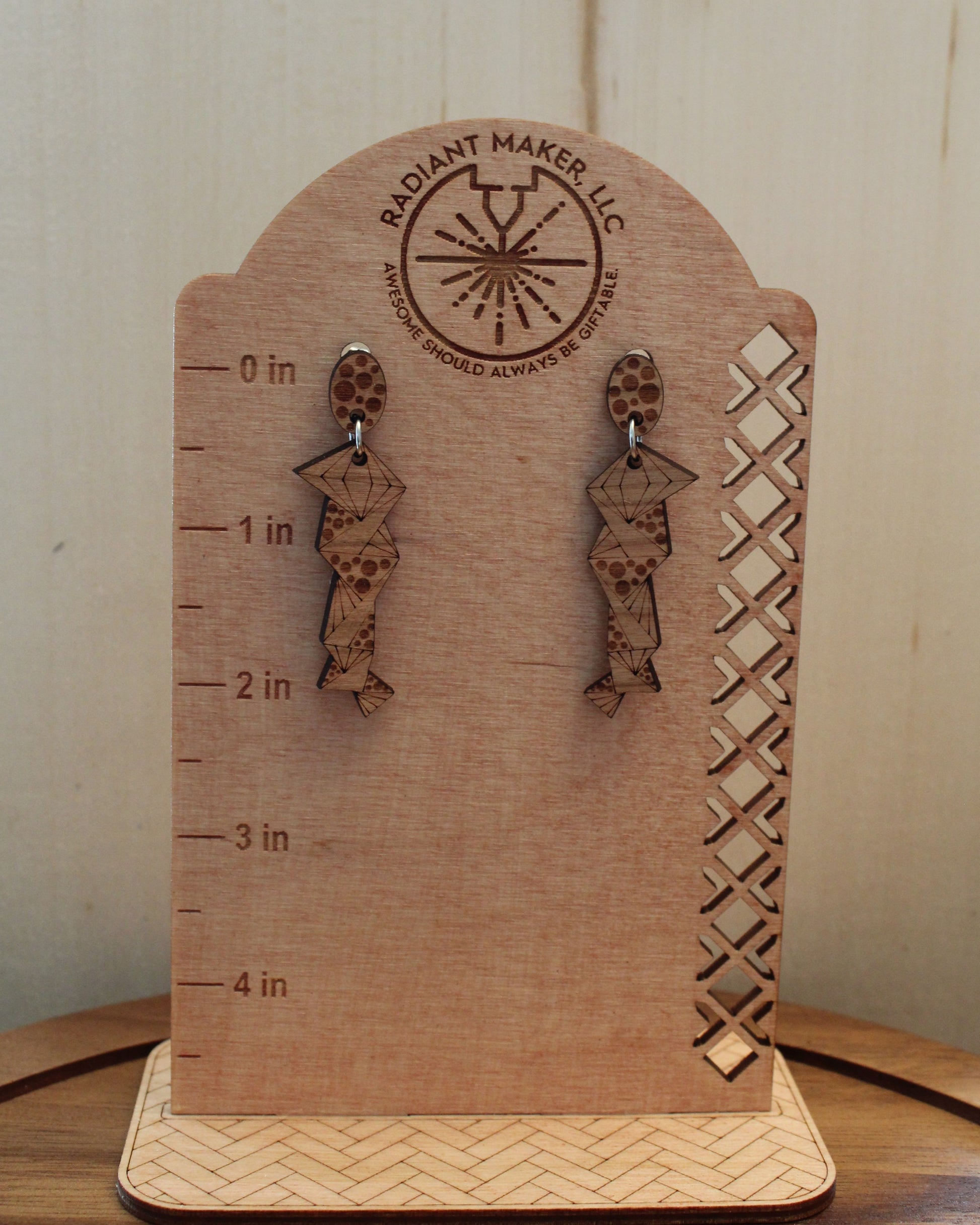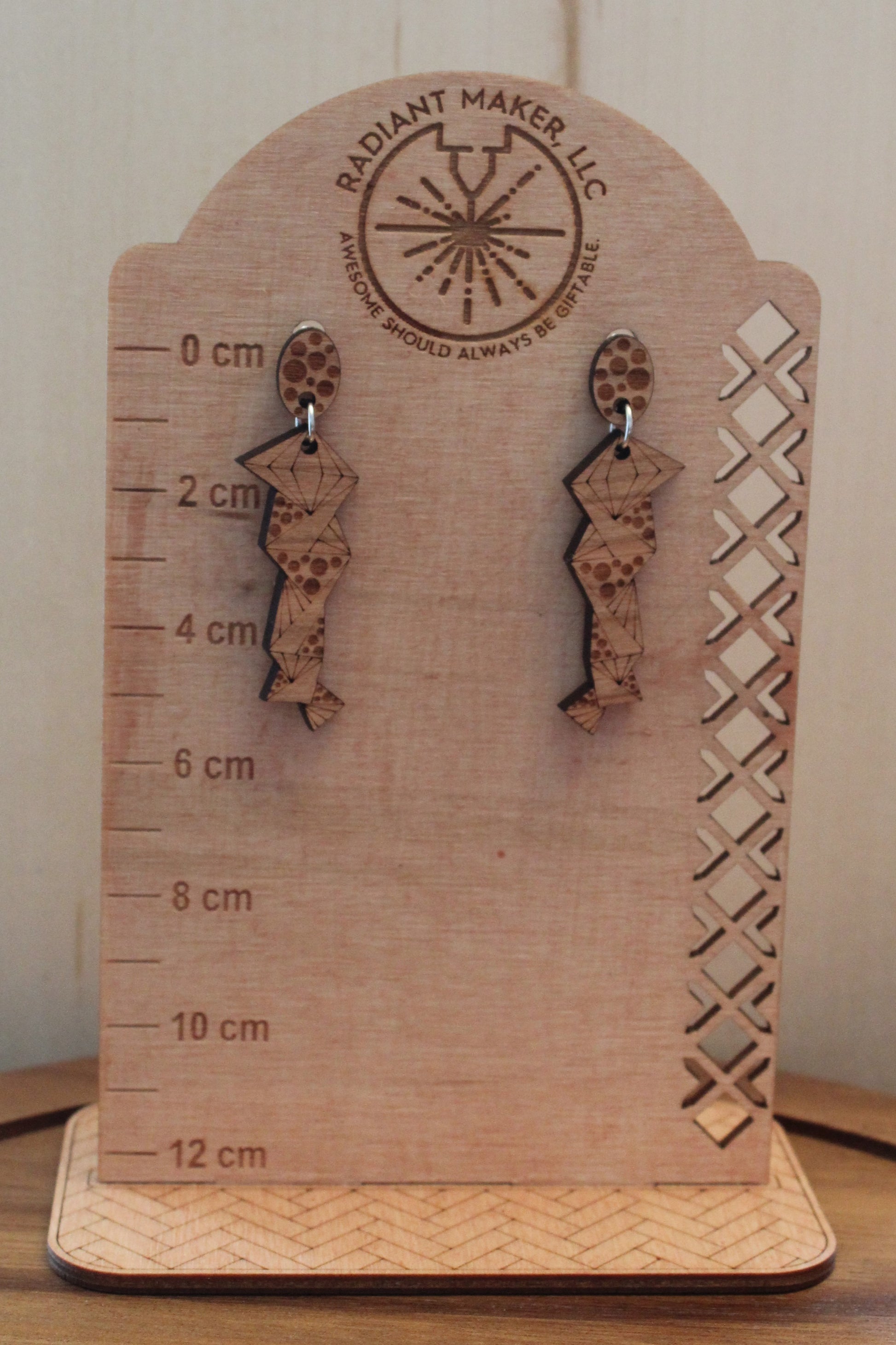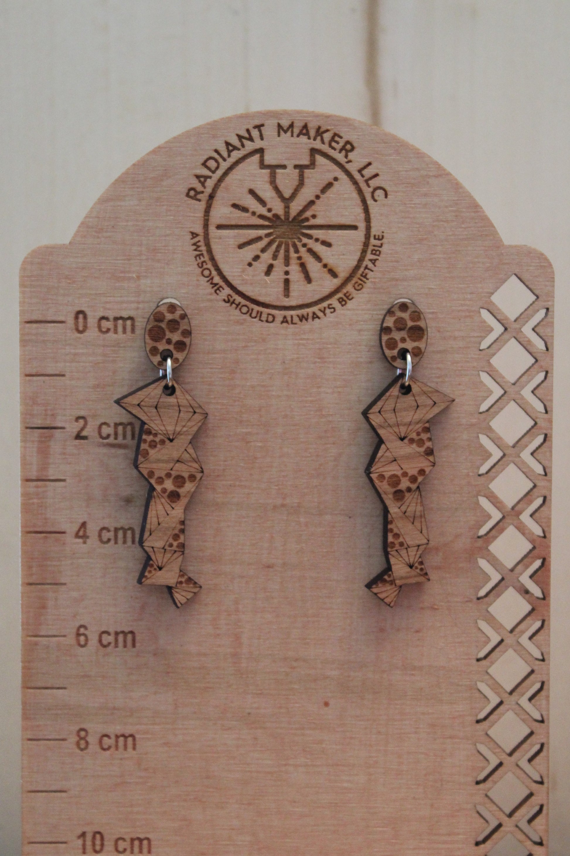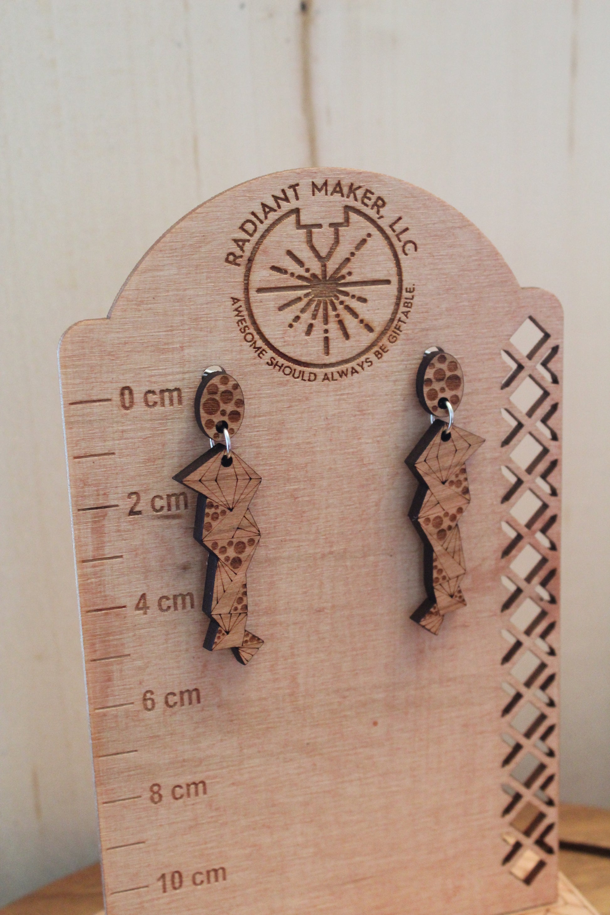 The earrings are laser engraved and cut from 1/8" thick wood and are sealed to resist scratching. The hooks are stainless steel hypoallergenic earrings and come with both a metal butterfly and rubber backing.