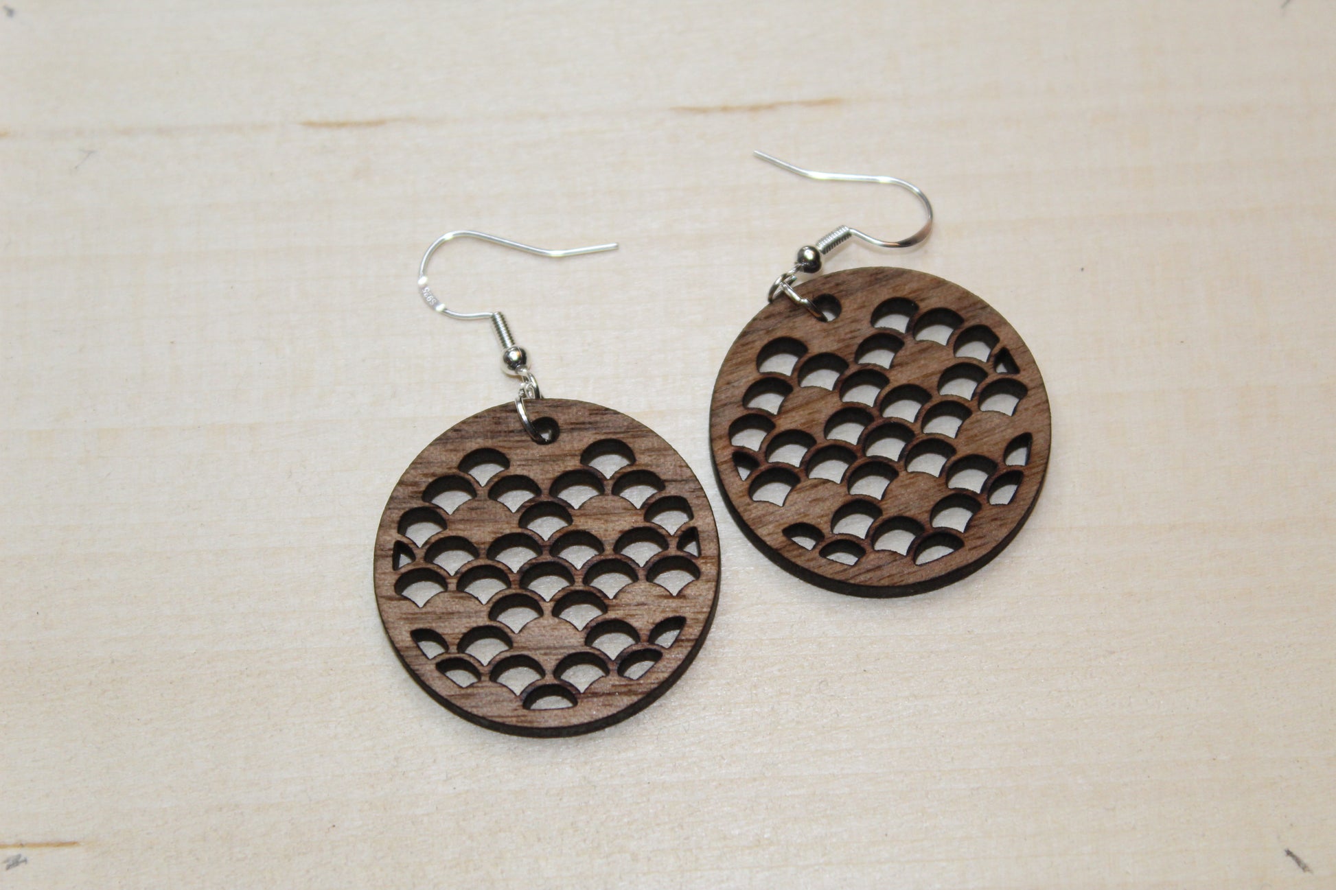 They are made from 1/8" thick walnut plywood and are sealed to resist scratching. The hooks are a sterling silver hypoallergenic earrings.