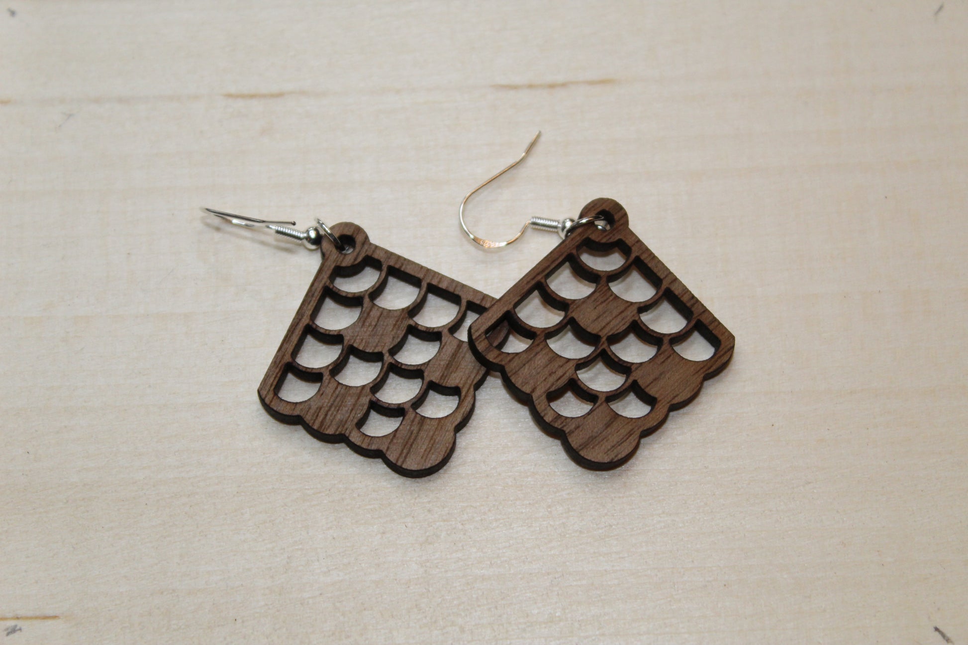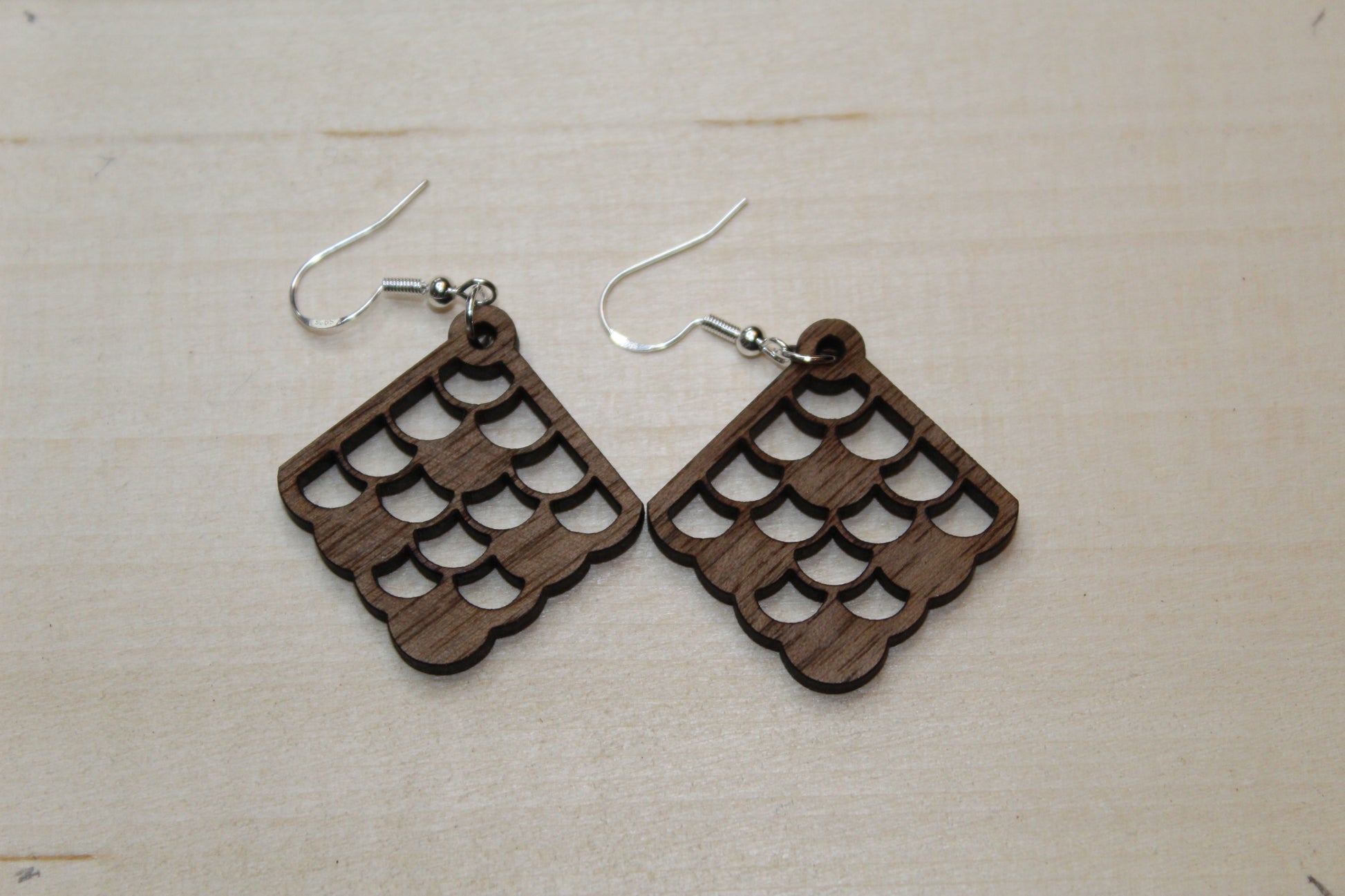 They are made from 1/8" thick walnut plywood and are sealed to resist scratching. The hooks are a sterling silver hypoallergenic earrings.
