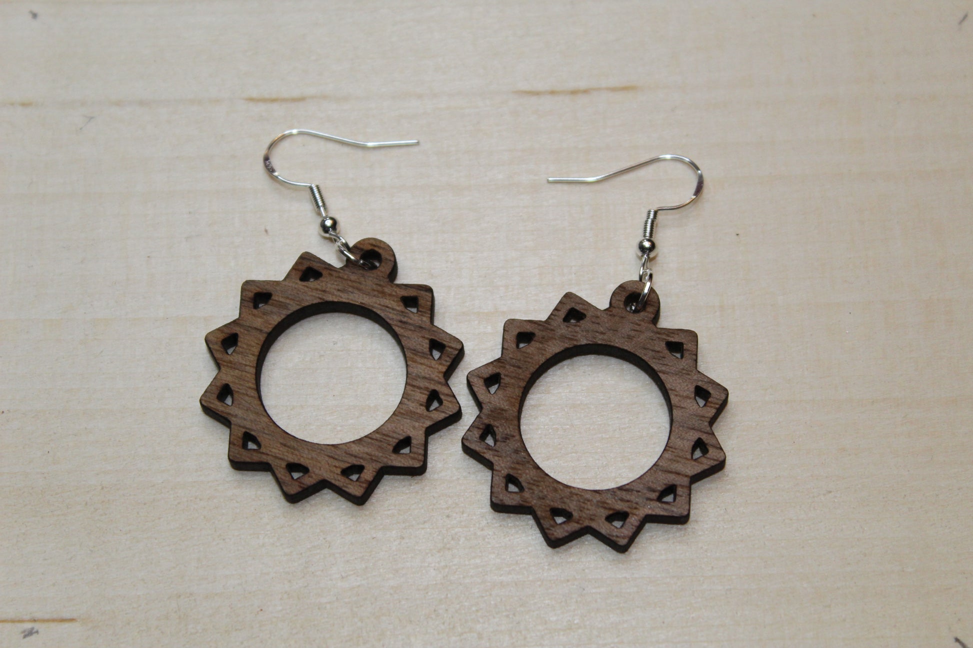 They are made from 1/8" thick walnut plywood and are sealed to resist scratching. The hooks are a sterling silver hypoallergenic earrings.