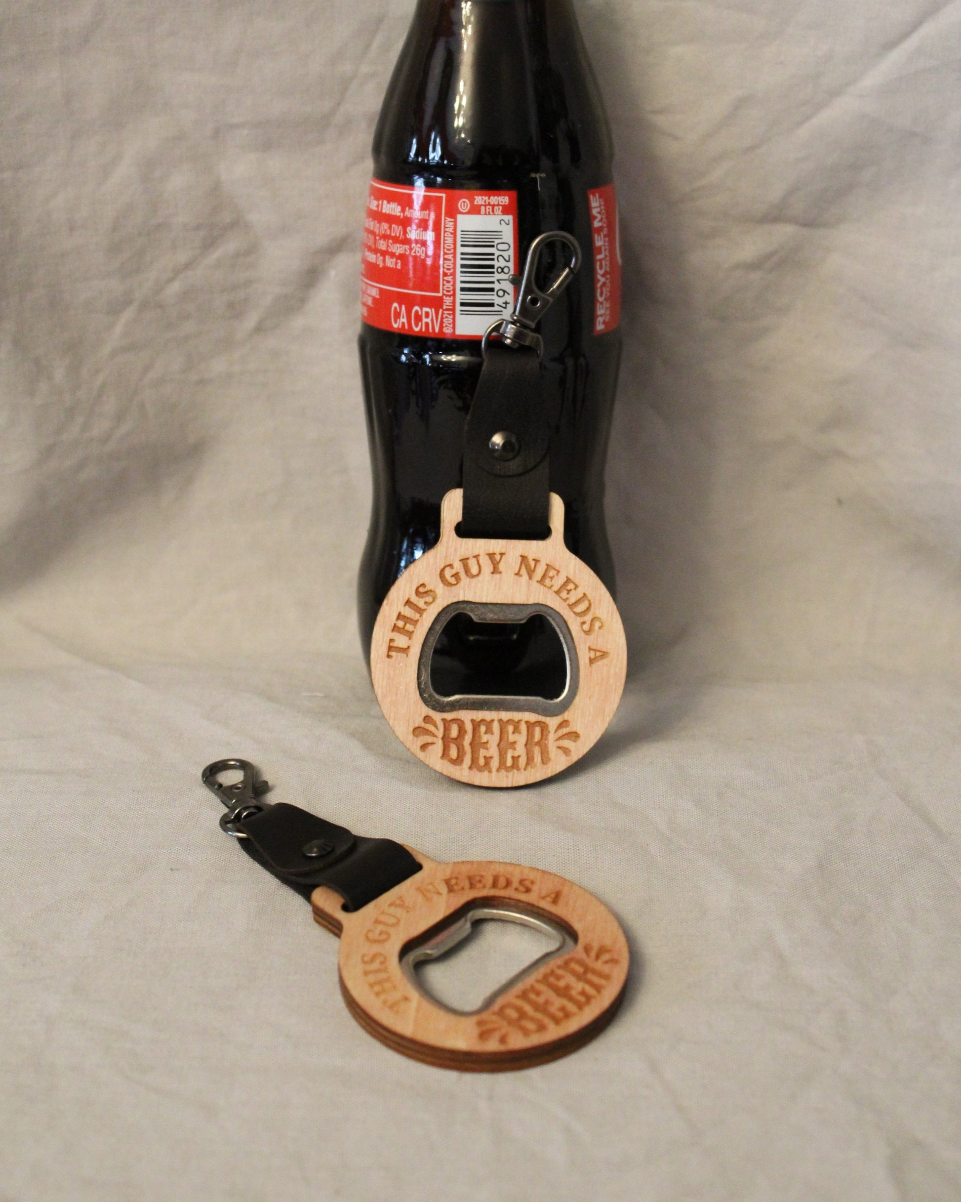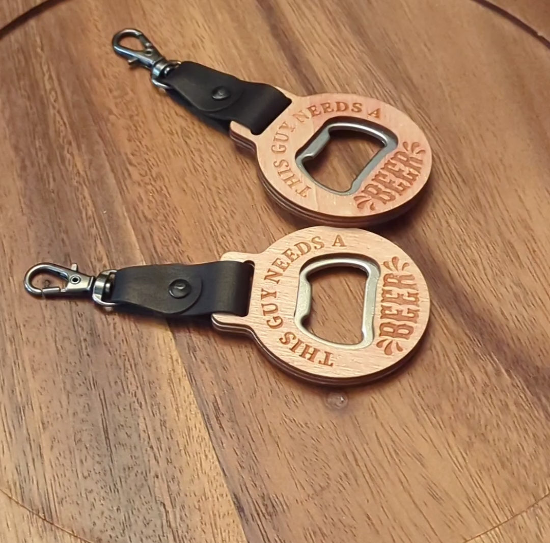 Openers are made from wood with a leather keychain strap and easy to operate snap hook keychain making it easy to take on and off your keys, bag, or any other item you want to hook it to.