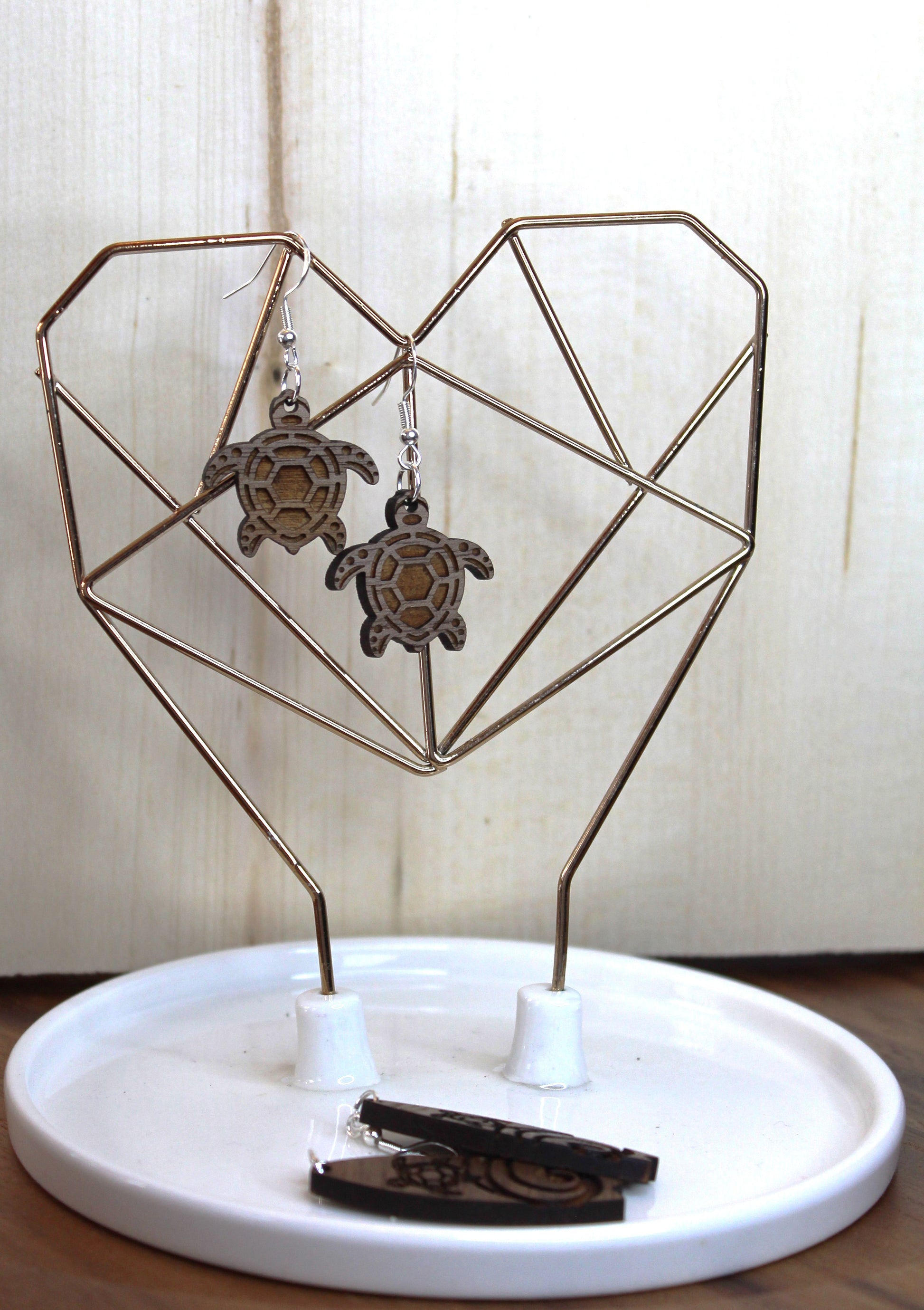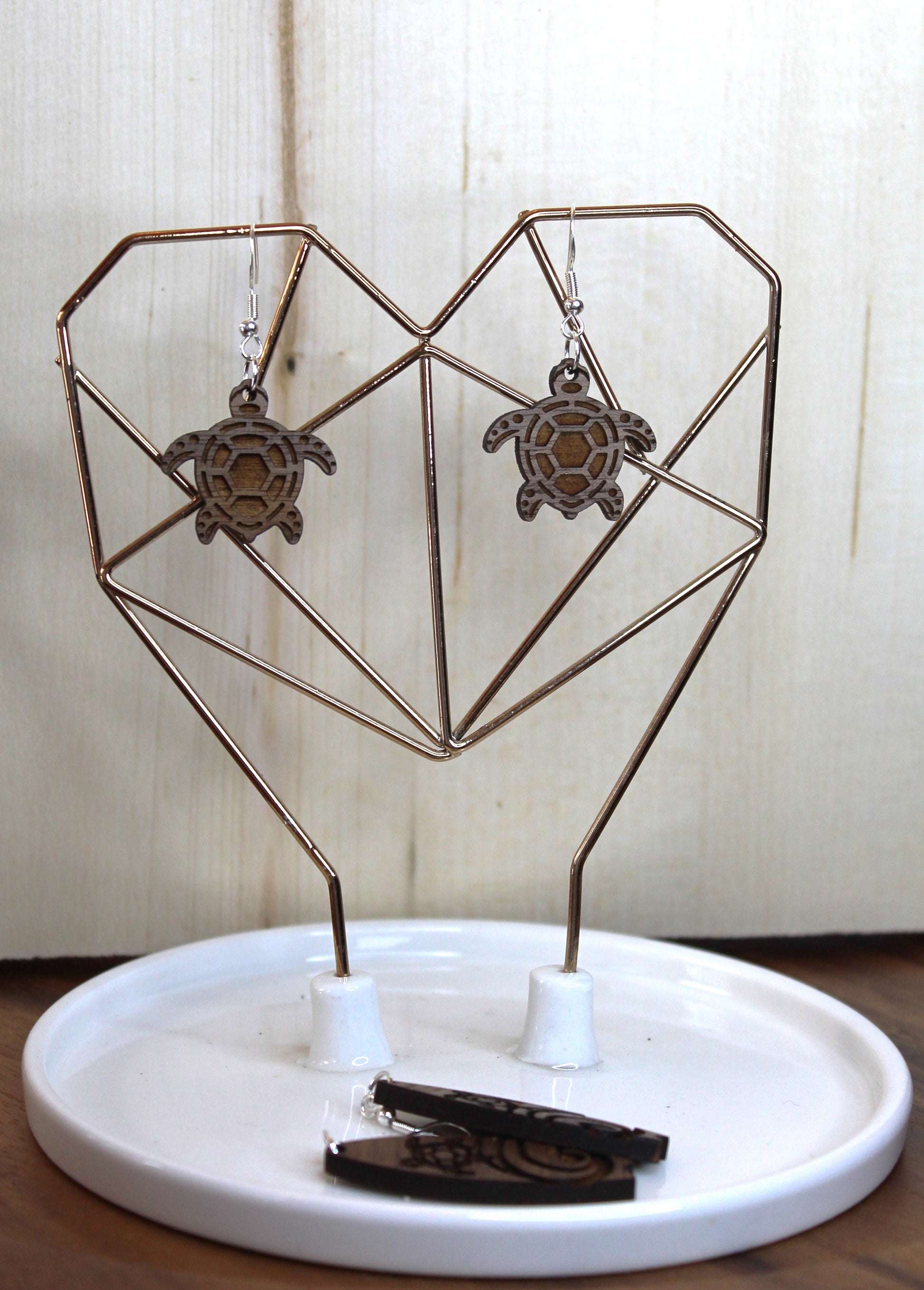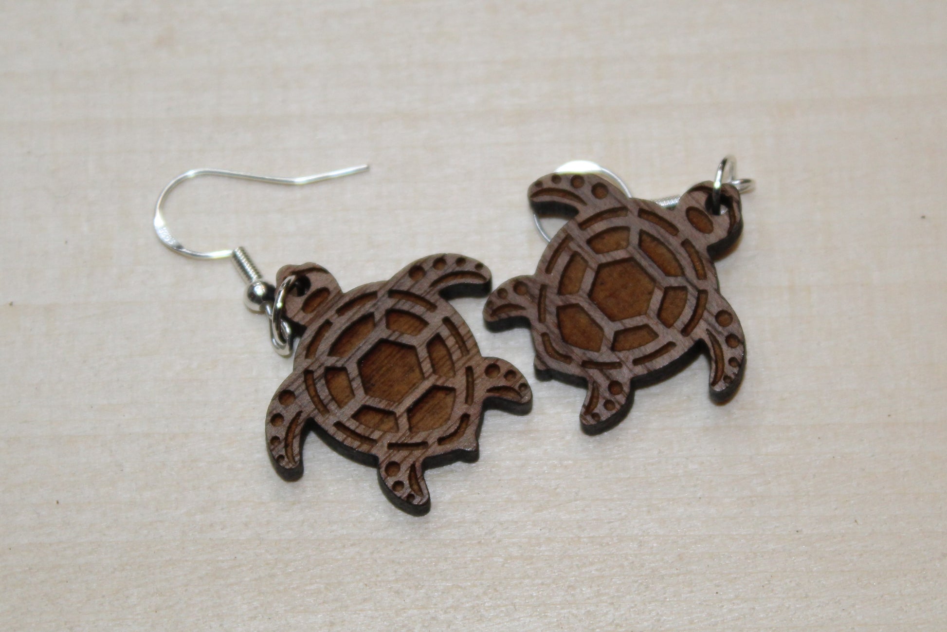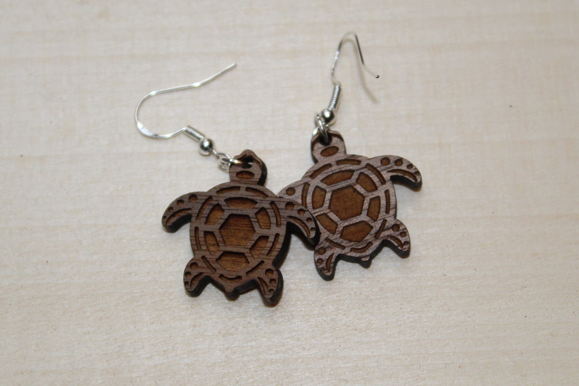 They are made from 1/8" thick walnut plywood and are sealed to resist scratching. The hooks are a sterling silver hypoallergenic earrings.