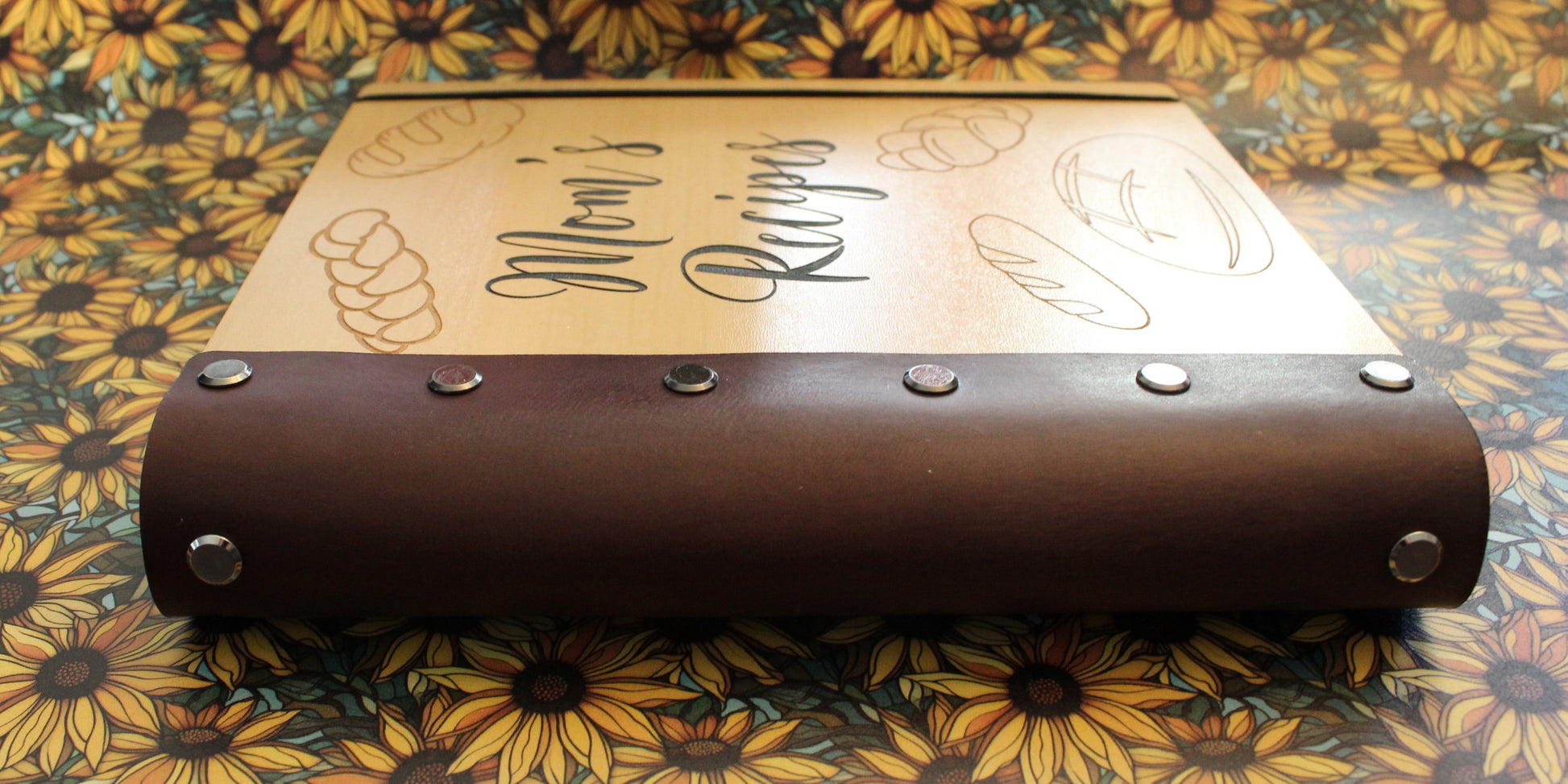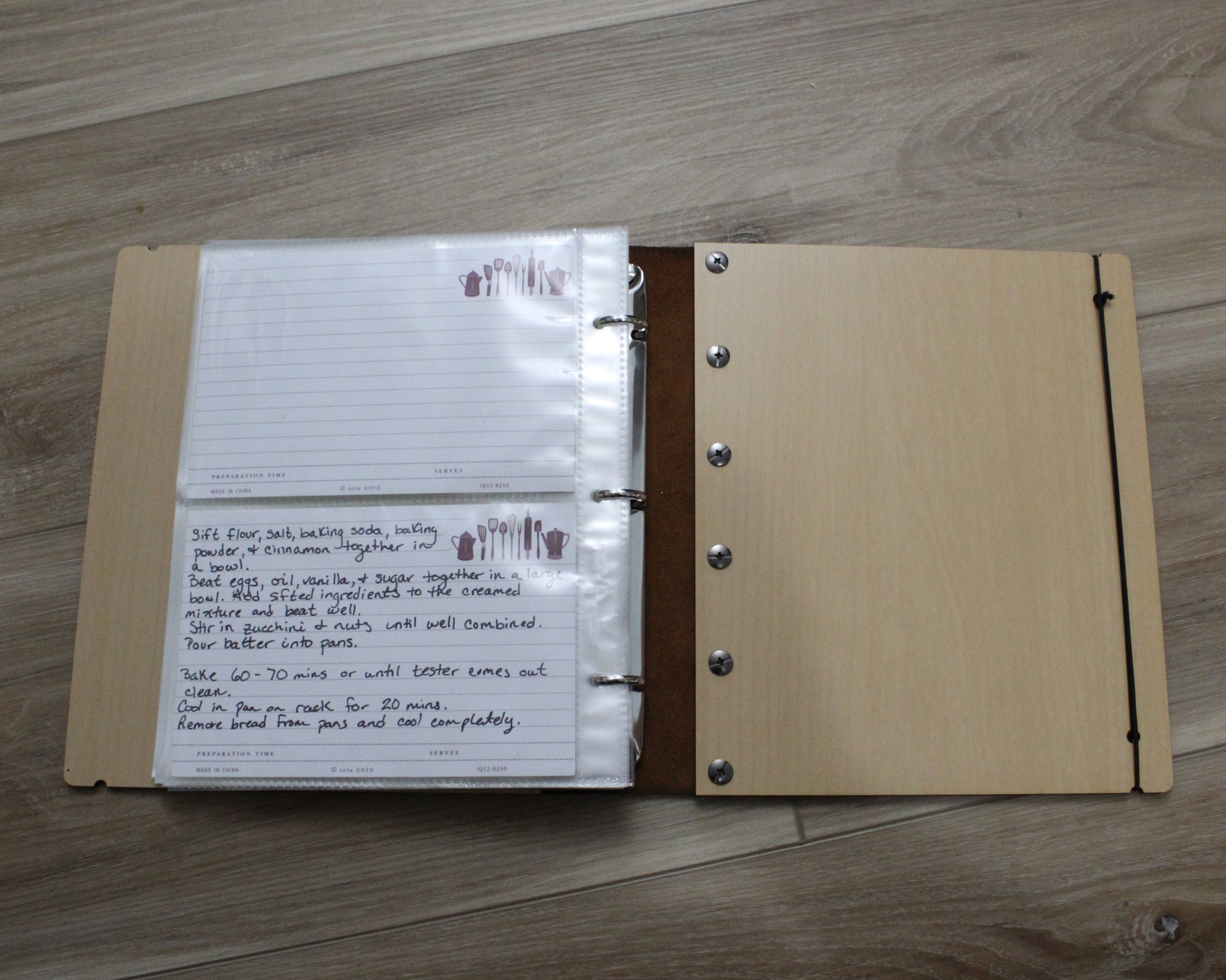 Constructed with an eco-wood product, the covers are resistant to spills and splatters. The binding is made from leather and has a 3-ring binder mechanism to hold the recipe protector pages in place.