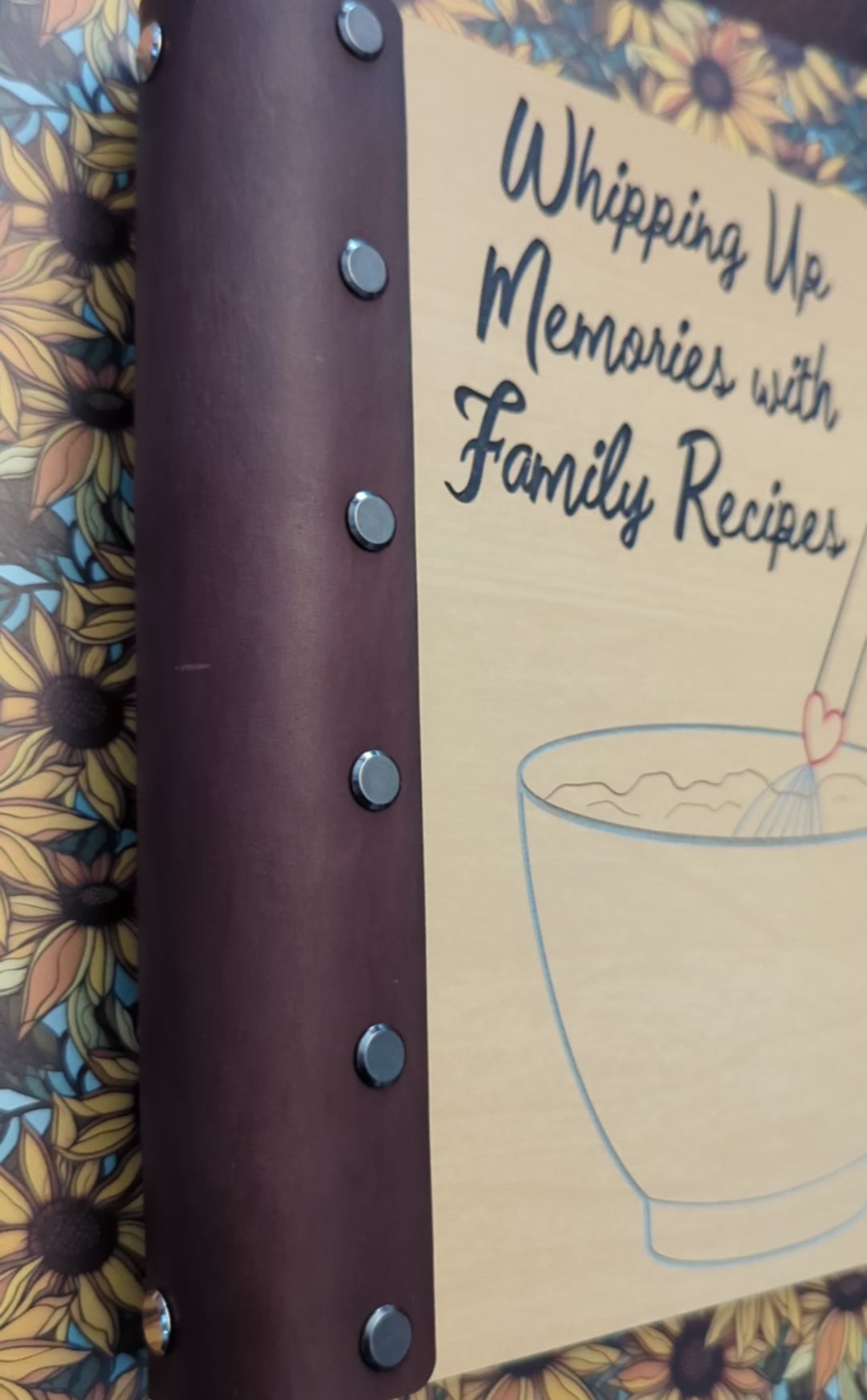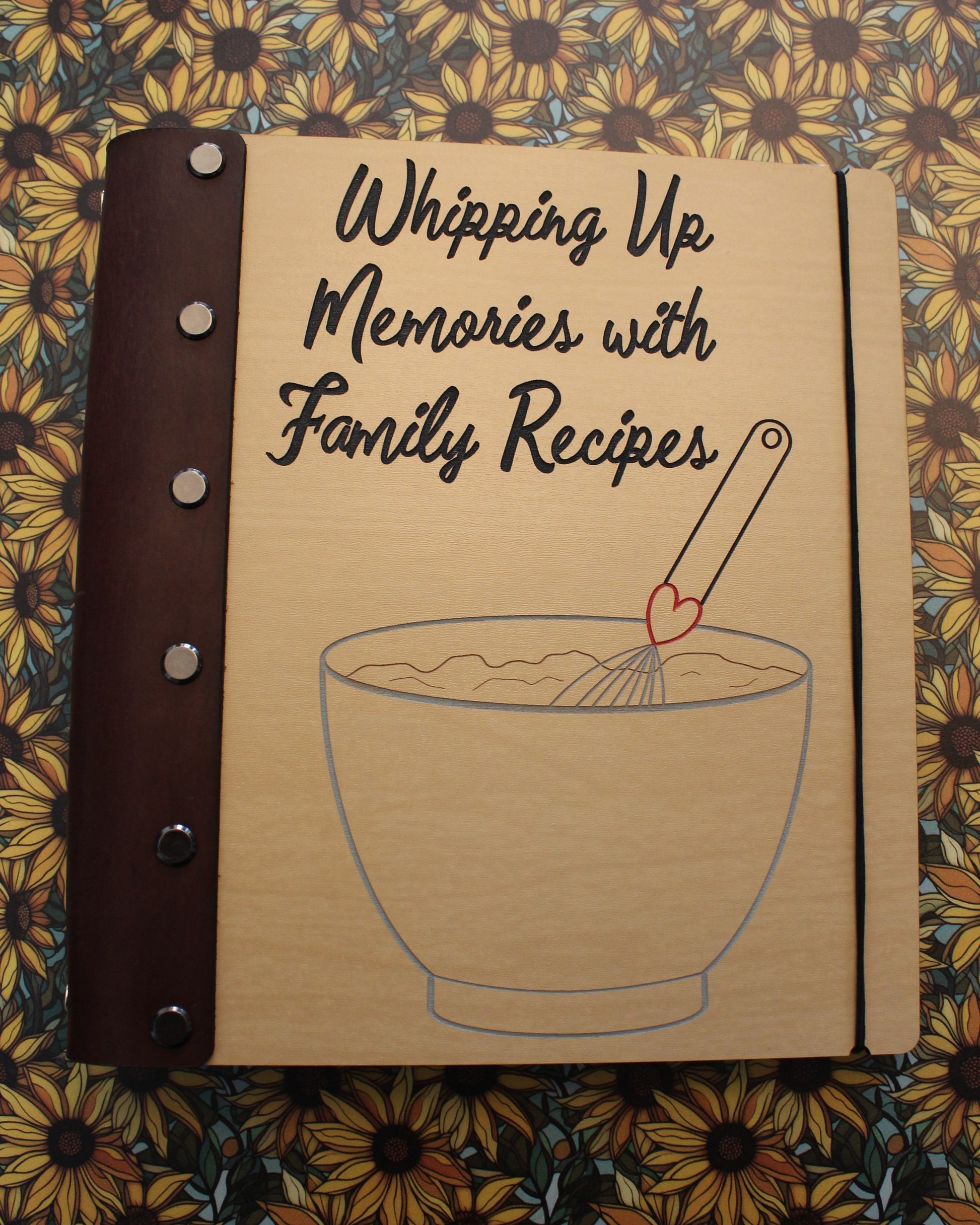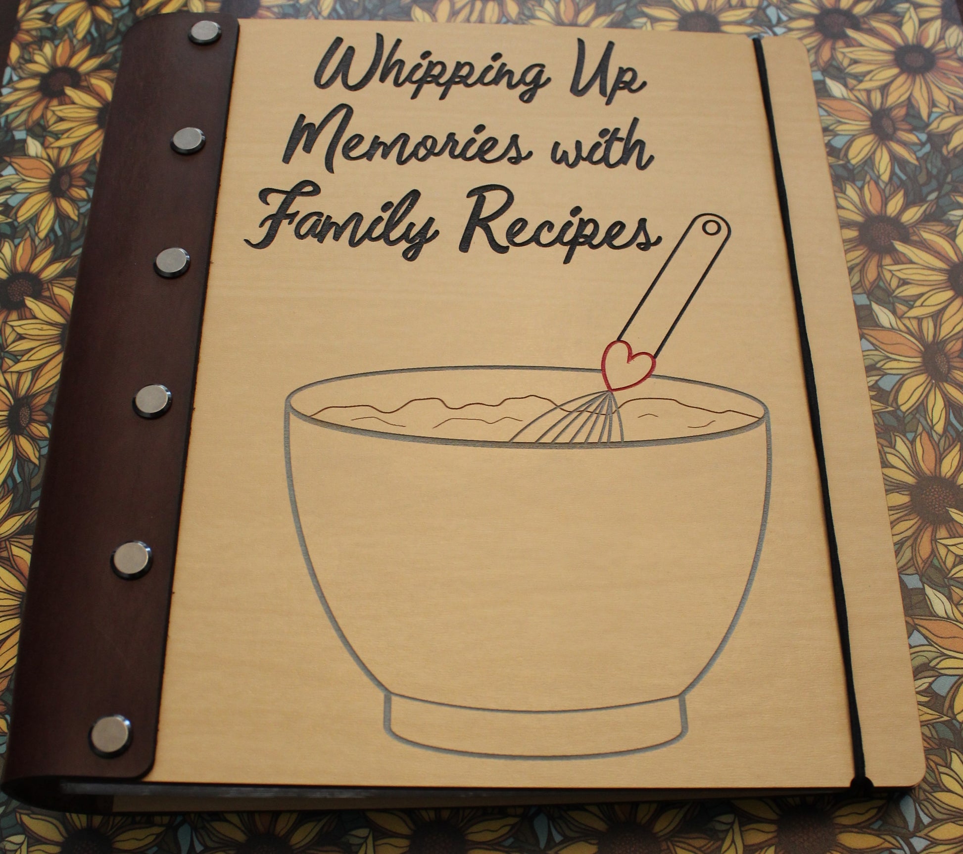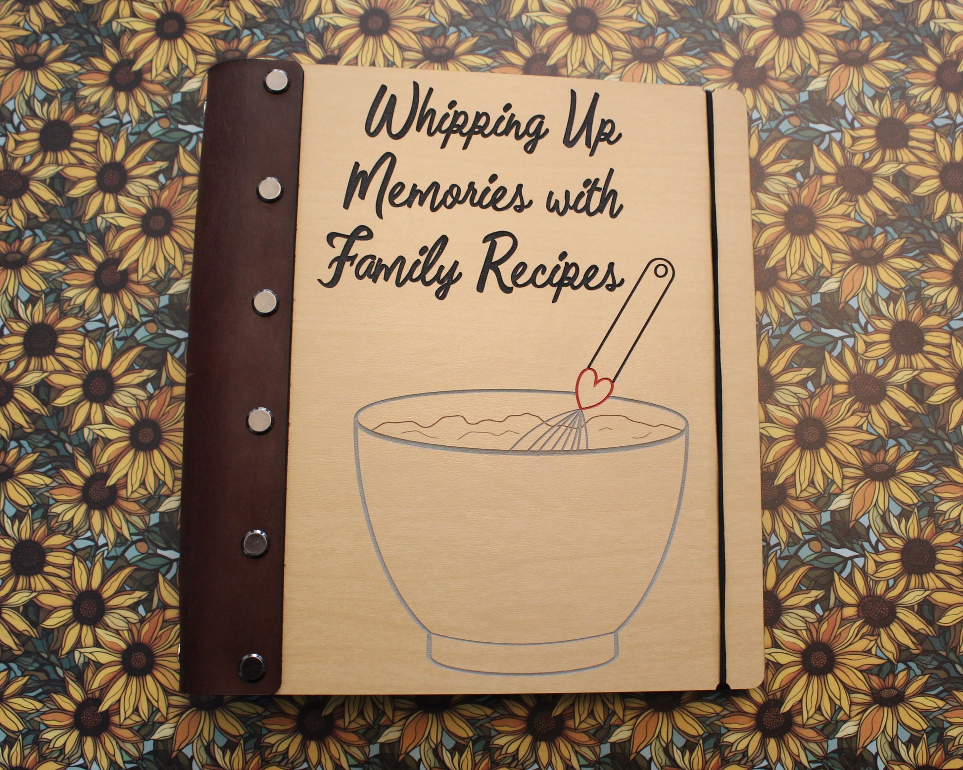 Whipping Up Memories with Family Recipes Leather Bound Wooden Cookbook- Personalization available, Half Legal A5 size book, 4x6 recipe cards